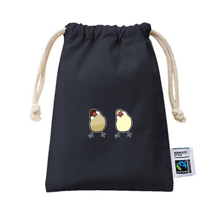 文鳥 巾着 フェアトレード コットン Sサイズ かしげる文鳥 2羽 バッグ 小物入れ 通勤 通学 ポーチ かわいい グッズ プレゼント 雑貨 お弁当袋 男の子 女の子